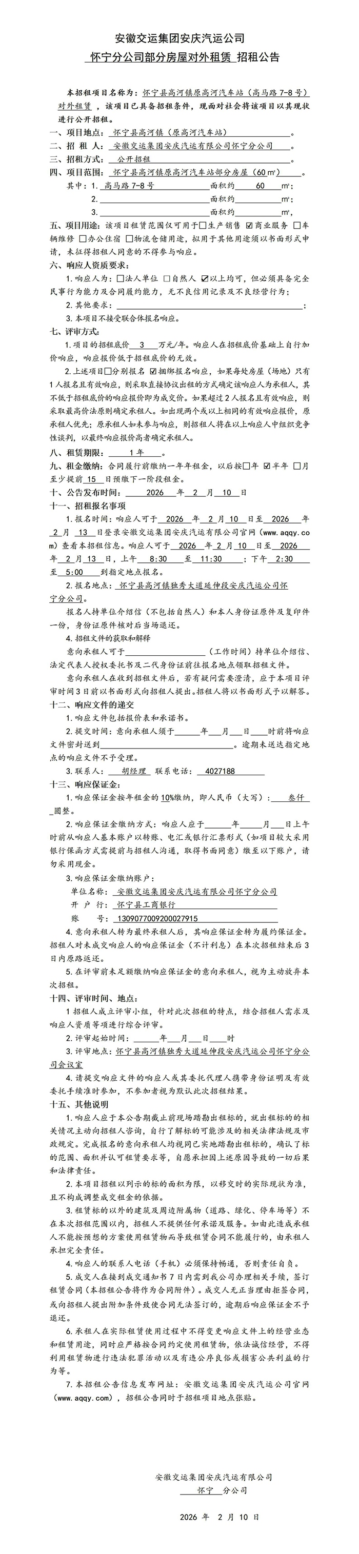 懷寧分公司部分房屋對(duì)外租賃招租公告