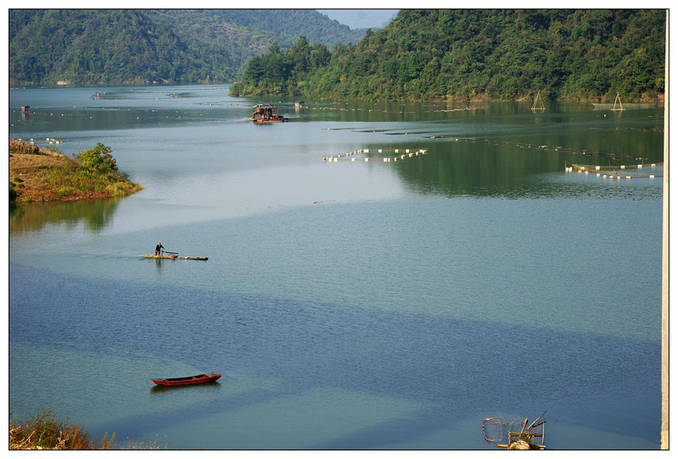 不知過了多久!也不知穿過了多少座隧道!我依然沉浸在遠離凡塵喧囂的鬧市、相伴于群山峻嶺,四季如春綠油油松柏夾雜著少許紅楓秋葉的幻想之中,間或在轉(zhuǎn)瞬即逝日薄西山的余暉照映下熠熠生輝!此時此刻的我已經(jīng)是到了忘我的最高境界,腦中忽然閃過歐陽老翁的一句至理名言——【醉翁之意不在酒,而在乎山水之間!】這句話用在此處真的是妙不可言!我那萬千思緒隨著飛馳的車輪早已飄到九霄云外,暗自為窗外如畫如詩的景象所迷惑、所陶醉、所依戀...!猛然間聽到一句非常熟悉且溫暖的話——爸爸!快看!到了磨子潭風景觀賞區(qū)了!我才恍然如夢驚醒,朝遠處向下望去好一個一望無際的“磨子潭”!其潭水清澈,魚影可現(xiàn);微風襲來,碧波蕩漾;譚中游筏,漁歌互答;這時女兒也詩意助興了!滿懷深情地吟誦——“磨子潭水-深千尺,不及‘爸媽’-送我情!”這句真是太絕了!女兒漸漸地長大了,懂得感恩戴德了。車子終于快要鉆進最后一個隧道了,我也不知道它是排第幾?感覺今天好像是專乘“高速隧道”之旅了?!在快要進入末了隧道的一霎那,我還特留戀地回頭朝窗外俯視一下,只見磨子潭中那無數(shù)的‘網(wǎng)箱’把整個潭水劃分成大小不等的方塊,好像一張碩大無比殘缺不全的圍棋盤面撒在幽深的譚中,我還來不及細數(shù)就立刻消失在我難以忘卻的視線中.....!